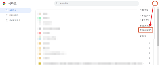 2. 북마크 관리자 내의 메뉴인 우측 상단에 점세개를 클릭한후 북마크 내보내기를 선택합니다.