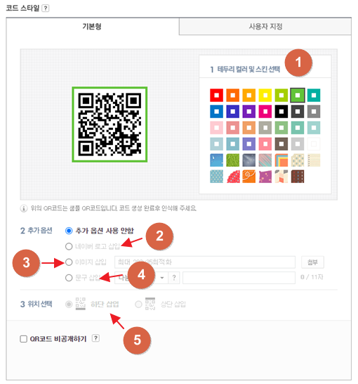 네이버 QR코드 만들기는 크게 기본형과 사용자 지정으로 구분됩니다. 차이는 사용자 지정의 경우 스킨 이미지를 커스텀할 수 있고, 중앙의 로고를 원하는 이미지로 선택할 수 있습니다. 위 이미지의 숫자별로 용도는 다음과 같습니다.