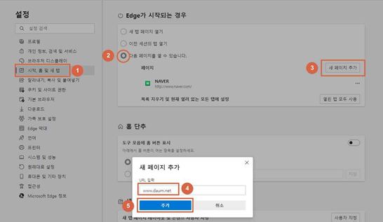엣지 브라우저 우상단의 점세개를 눌러주고 바로 설정을 선택합니다. 시작, 홈 및 새 탭을 선택한 후 다음 페이지를 열 수 있습니다. 체크한 후 새 페이지 추가를 눌러주고 URL입력후 추가를 눌러주면 엣지에서 다음을 시작페이지로 설정할 수 있습니다.