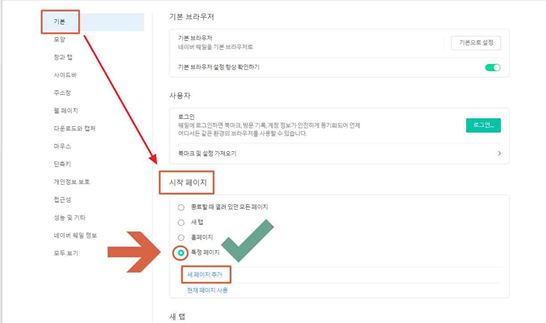 크롬이나 엣지와 마찬가지로 점세개를 클릭한후 설정으로 들어갑니다. 기본탭에서 시작페이지에서 특정페이지를 체크한후 새페이지 추가를 눌러줍니다. 팝업창이 뜨면 URL을 입력후 추가를 눌러 웨일에서 다음을 시작페이지로 설정합니다.