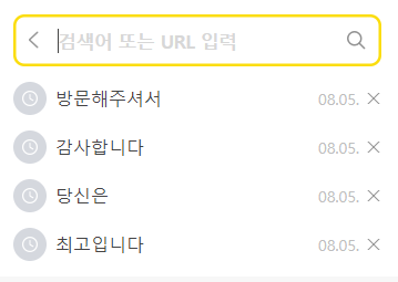 최근 검색어가 계속 있는것이 편하지만 일부 검색어만 삭제하고 싶은 경우도 있을 수 있습니다. 그런 경우에는 아래와같이 나오는 최근검색어에서 삭제하고자하는 검색어 오른쪽의 " X "를 터치해주시면 됩니다.