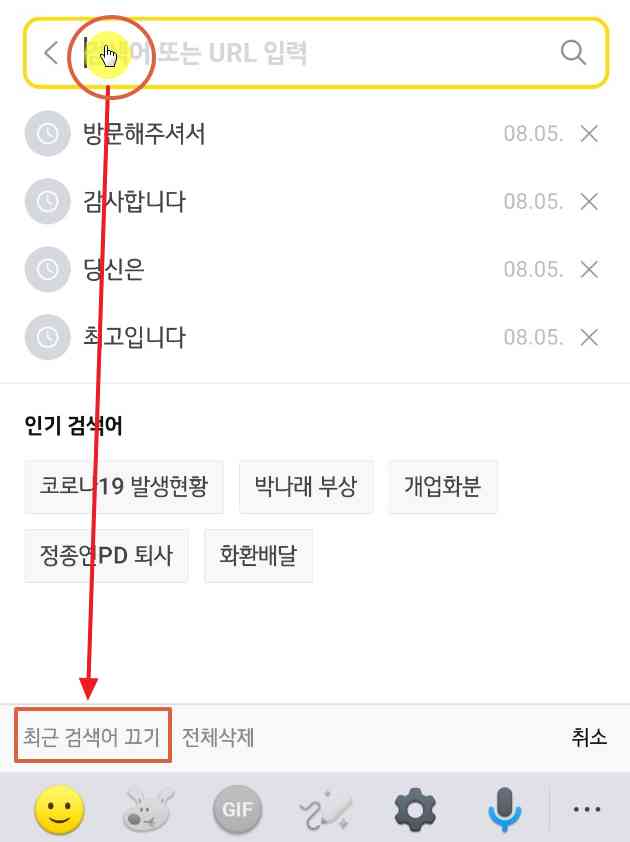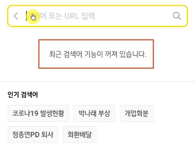 3. 다시 검색창을 터치해보면 아래와 같이 최근 검색어 기능이 꺼져 있는것을 확인할 수 있습니다.