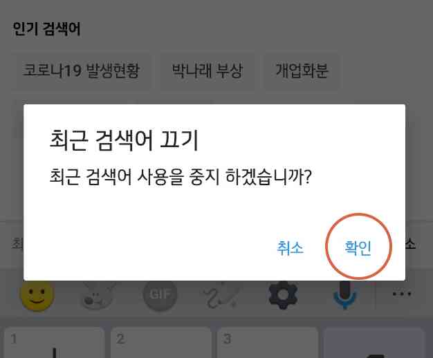 2. 최근 검색어 사용을 중지하겠냐는 확인을 진행합니다. 여기서 확인을 터치합니다.