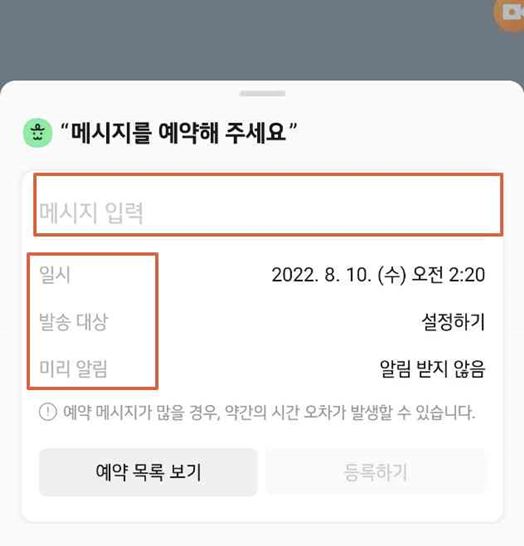 - 메시지입력: 예약 전송할 메시지를 입력합니다.