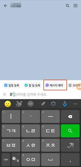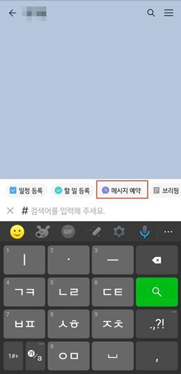 카카오톡 대화창에서 " # "을 눌러줍니다. 나타나는 메뉴에서 " 메시지 예약"을 터치합니다.