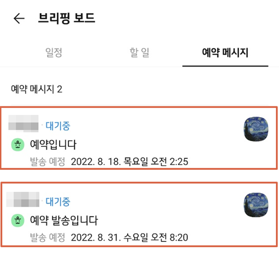 카카오톡 메시지 예약전송 리스트가 보이며 이 중에서 수정을 원하는 메시지를 터치합니다.