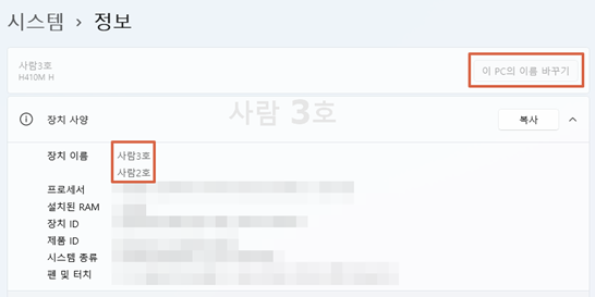 안녕하세요. 사람 3호입니다. 이번 시간에는 컴퓨터 이름 바꾸는 방법을 알아볼까 합니다. 저 같은 경우 윈도 11로 업그레이드하면서 자동으로 부여된 컴퓨터 이름을 사용했는데 사용자 분리를 위해서 컴퓨터 이름을 바꾸기로 결정했습니다.