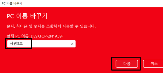 PC 이름 바꾸기 팝업창이 뜨면 바꾸고자 하는 이름을 입력 후 다음을 클릭합니다. 이때 컴퓨터를 다시 시작해야 컴퓨터 이름이 바뀌니 참고하시기 바랍니다.