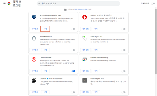 확장 프로그램 관리에서는 구글 크롬에 현재 설치되어 있는 확장프로그램 전체가 보여집니다. 이곳에서 삭제하고자 하는 확장프로그램을 선택한 후 " 삭제 " 버튼을 클릭해 크롬 확장프로그램 삭제를 진행하면 됩니다.