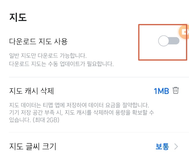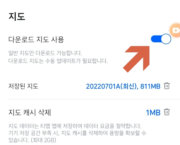 티맵의 경우 지도를 미리 다운로드 하여 네비게이션 이용시 데이터를 절약할 수 있는 기능이 있습니다. 다만 지도를 다운로드하기 전에 반드시 와이파이 환경에서 다운로드 받으시길 권장드리는데 이유는 약 810mb의 용량으로 비교적 용량이 크기 때문입니다. 또한 실시간 지도를 사용시에는 실시간 지도 업데이트가 가능하지만 다운로드 지도를 사용할 경우 수동 업데이트를 해줘야 하는점 잊지 마시길 바라구요.
