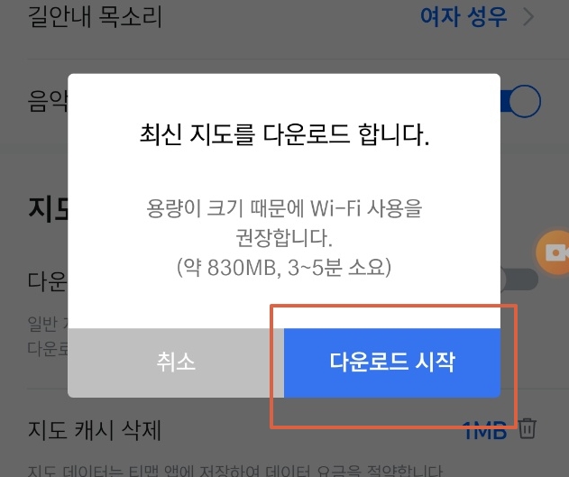 아래와 같이 최종적으로 다운로드 할것인지 묻는 창이 뜨면 다운로드 시작을 터치해주면 다운로드가 금방 완료됩니다. 오른쪽 이미지에서 보시는거처럼 다운로드 지도 사용이 활성화 된것을 확인하실 수 있습니다.